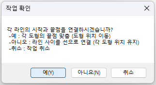 선택된 선들을 어떻게 이어붙일지 확인하는 창이 뜨게됩니다. '예'를 누르면 현재의 선들의 위치를 확인하여 가장 인접한 선들을 이어붙이게 되고, '아니오'를 누르면 현재 있는 도형을 그대로 두고 끝점들을 연결하는 선을 삽입하게 됩니다.